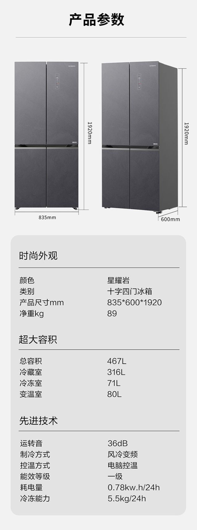 创维BCD-467WXQGPSH 星耀岩467升双系统十字四门冰箱 60cm超薄平嵌 双循环系统 -32度深冷速冻BO 一键待发