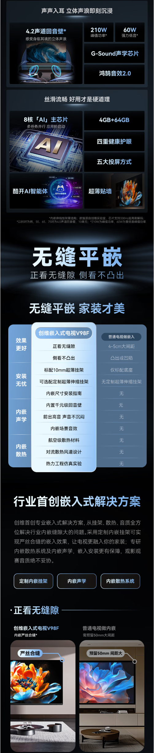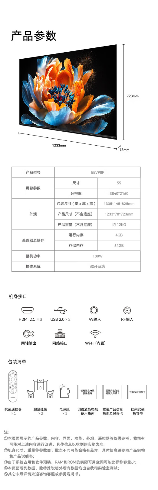 创维 无界云原色智控V98F 平板电视原色智控智慧屏超薄护眼电视机一体机55V98F 55英寸 BK