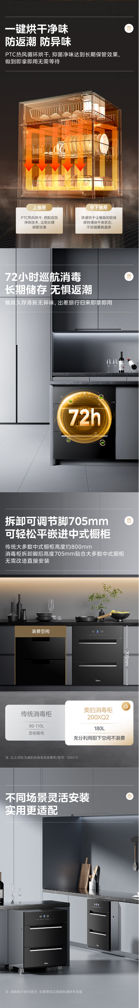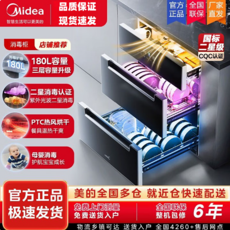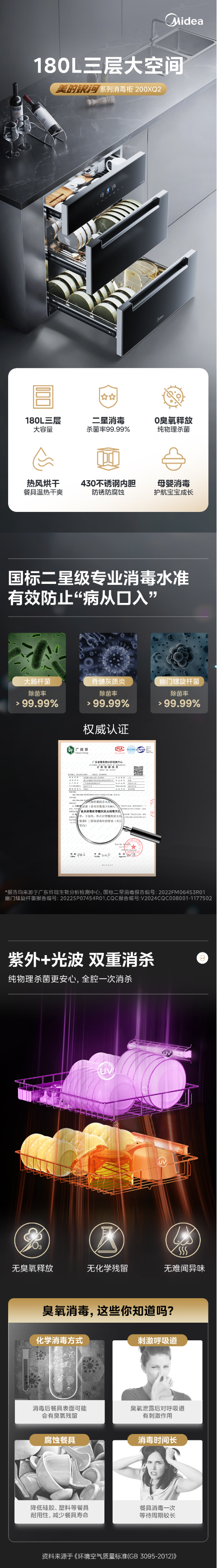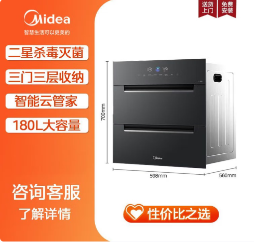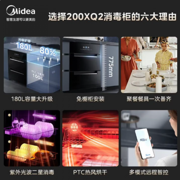 美的(Midea)消毒柜嵌入式家用 厨房餐具碗柜碗筷 180L三层 婴儿奶瓶不锈钢紫外线 200XQ2银河