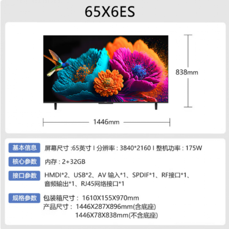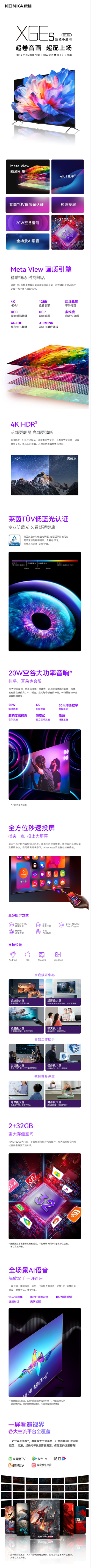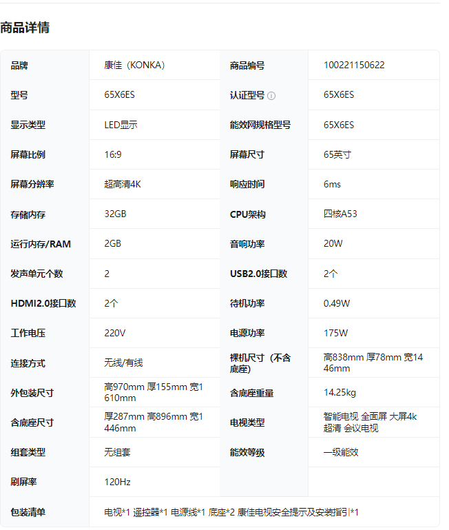 康佳电视 65X6ES 65英寸 2+32GB 4K超清全面屏 一级能效 智能液晶平板会议电视 BN