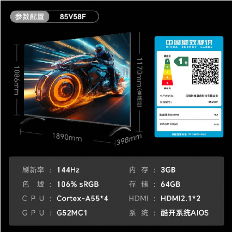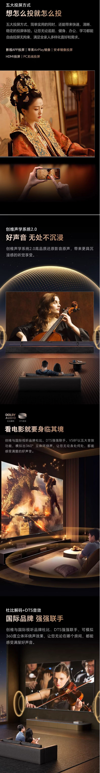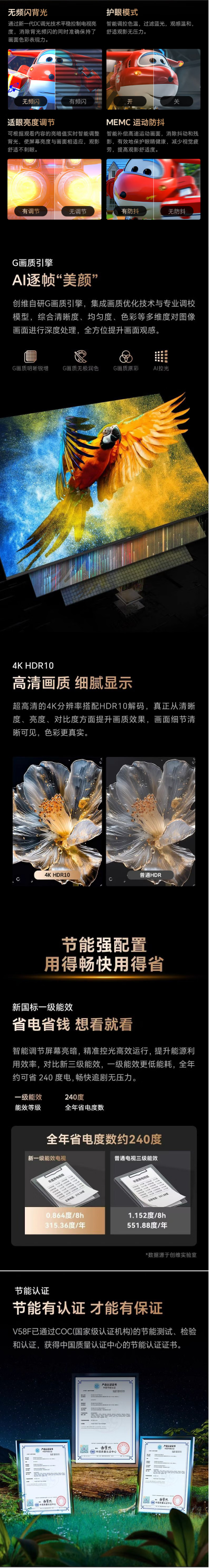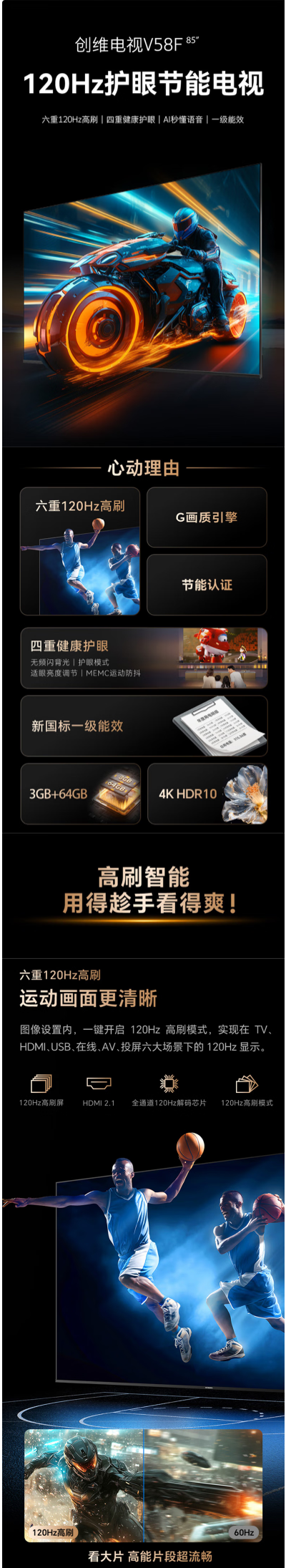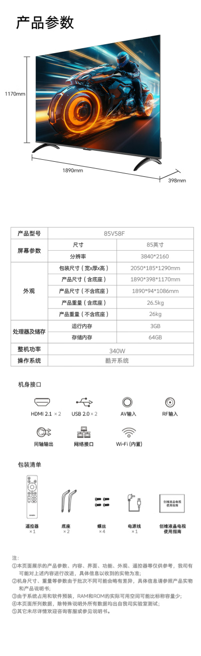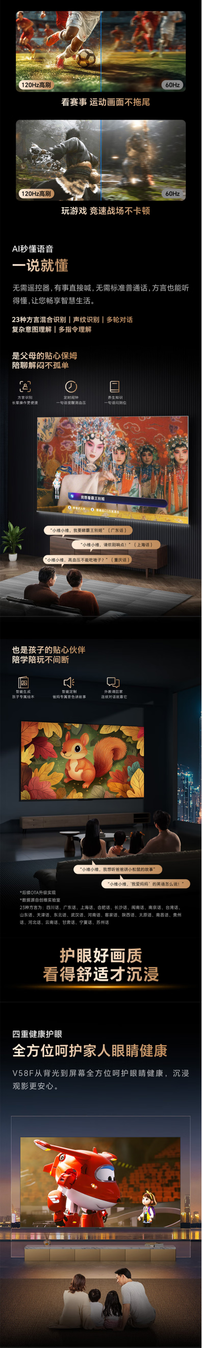 创维85英寸85V58F节能电视 六重120Hz高刷 四重健康护眼 AI秒懂语音 3+64G新国标一级能耗