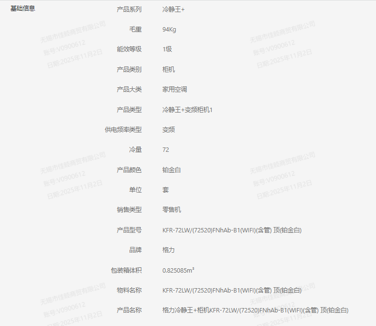 格力3匹 KFR-72LW/(72520)FNhAb-B1(WIFI)(含管) 顶(铂金白) 冷静王+变频柜机1级 BK
