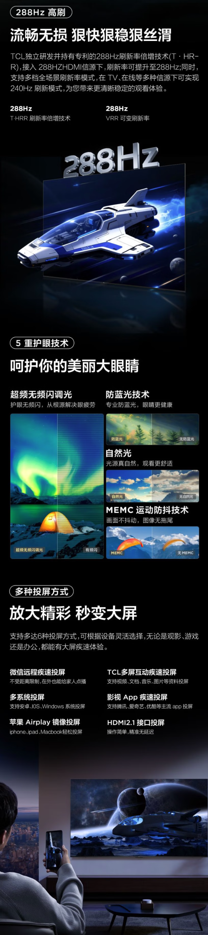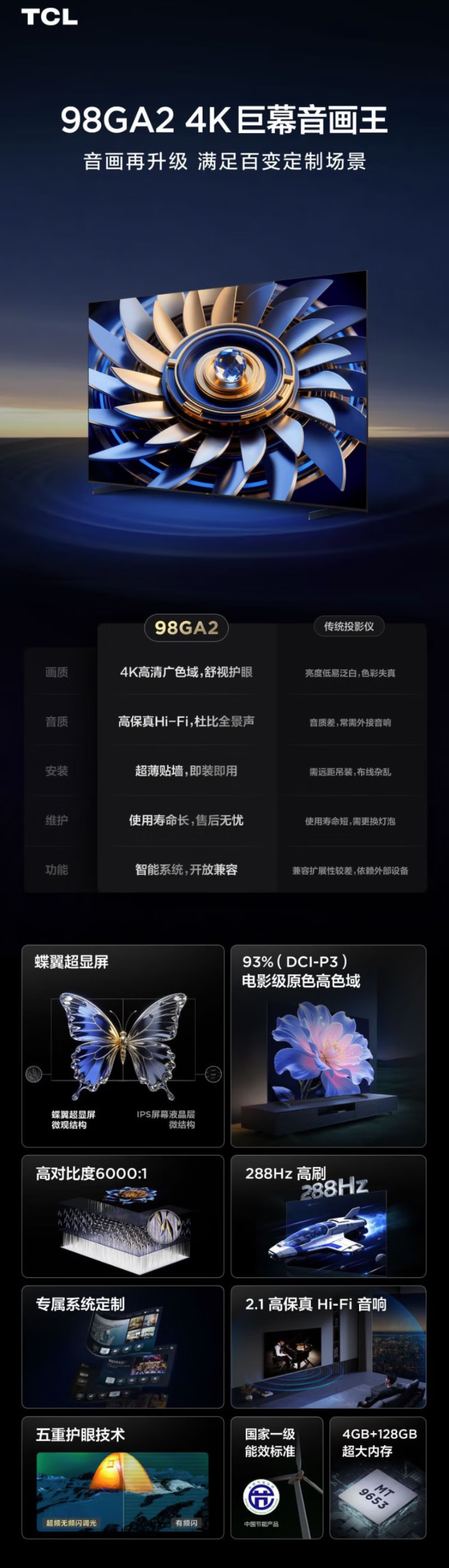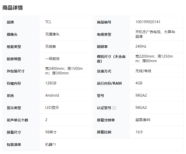 TCL 98GA2 平板电视 五重护眼技术 一级能效 288Hz高刷 98吋 节能电视 BK