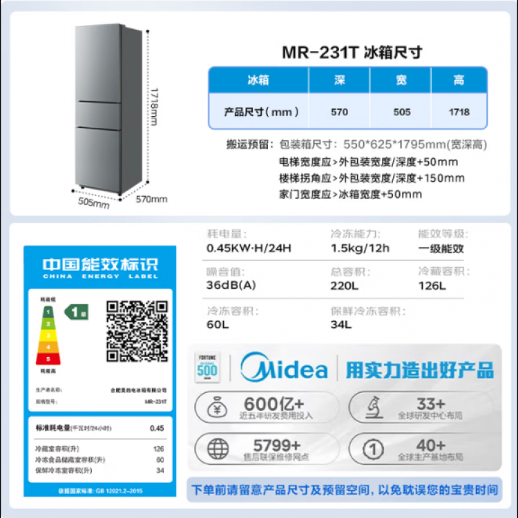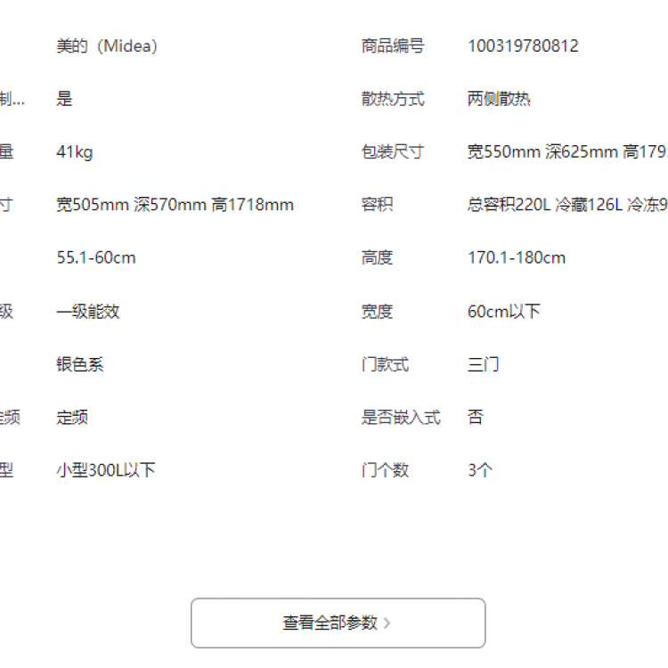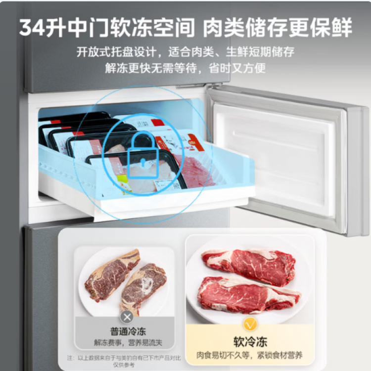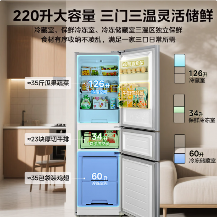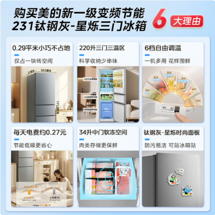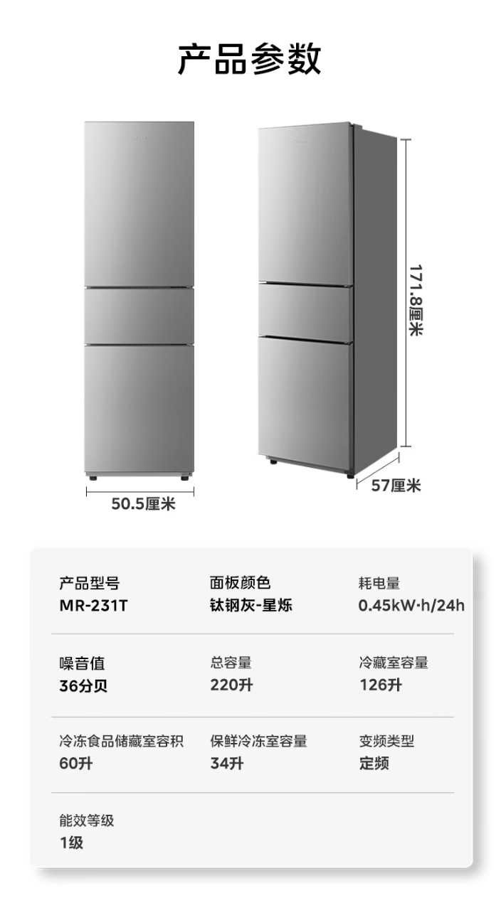 美的(Midea)MR-231T 220L三门冰箱灰色租房家用客厅宿舍小型冰箱三开门三温低耗省电低音运行 BN