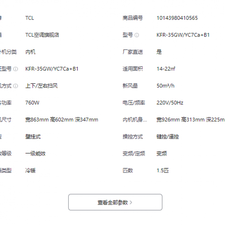 TCL空调KFR-35GW/YP7Cb+B1 1.5匹新一级能效变频冷暖语音大新风量小蓝翼P7 Air家用壁挂式家用空调挂机 BM