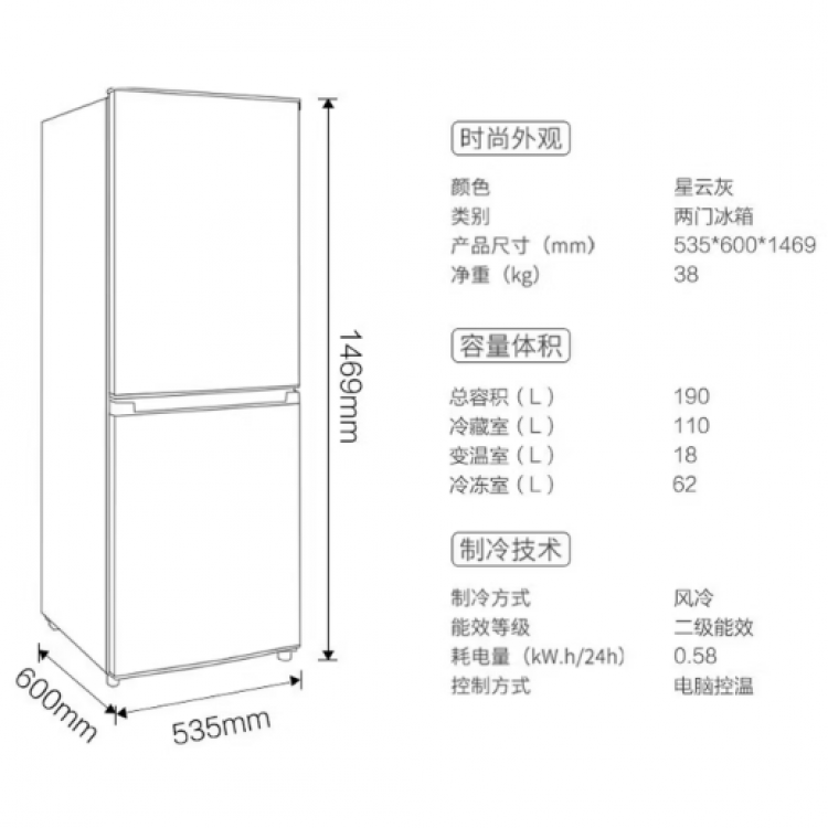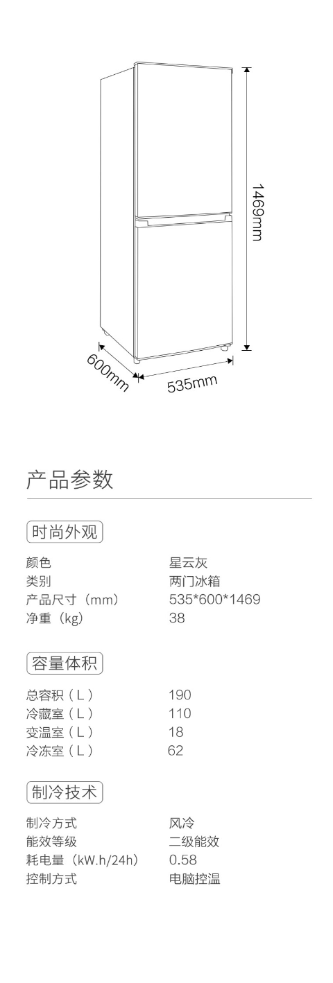 创维 BCD-190WYF_星云灰 190升直冷两门冰箱 小巧机身 拉丝抽屉面罩 食品级内胆材质 BO 一键待发