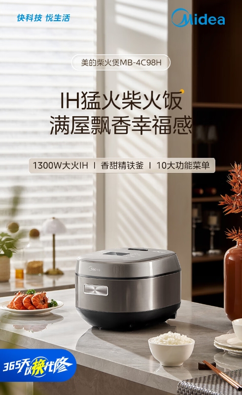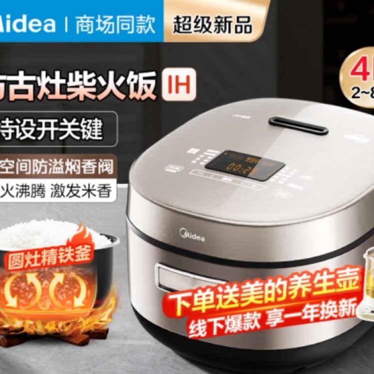 美的电饭煲 MB-4C98H 4L 家用电饭锅 2-8人大容量 IH电磁加热煮饭锅 精铁釜内胆 智能快速电饭煲 IH仿古灶柴火包锅 MYXBI