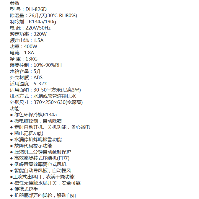 百科特奥 DH-826D 除湿机 适用面积15-50㎡ 移动式 除湿量26升/天
