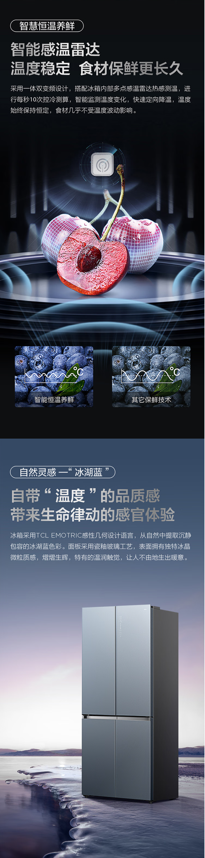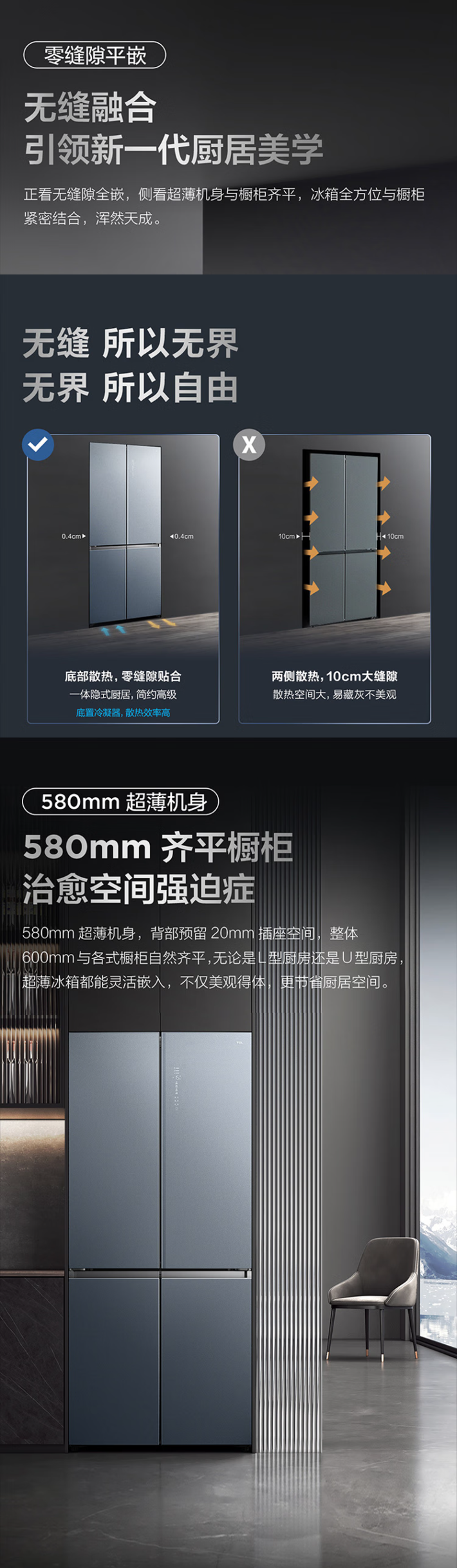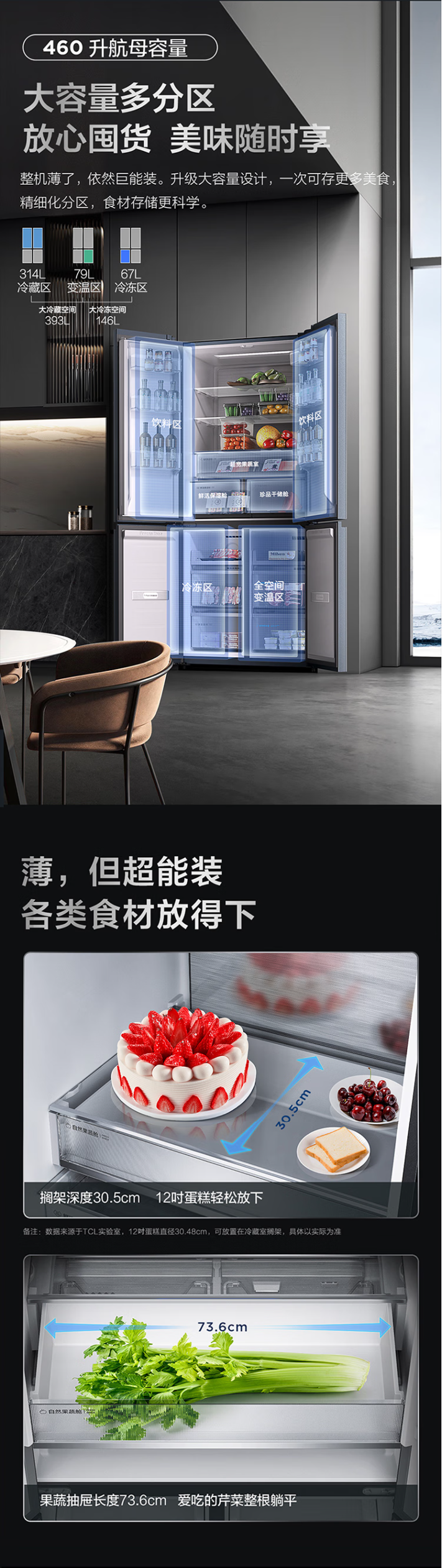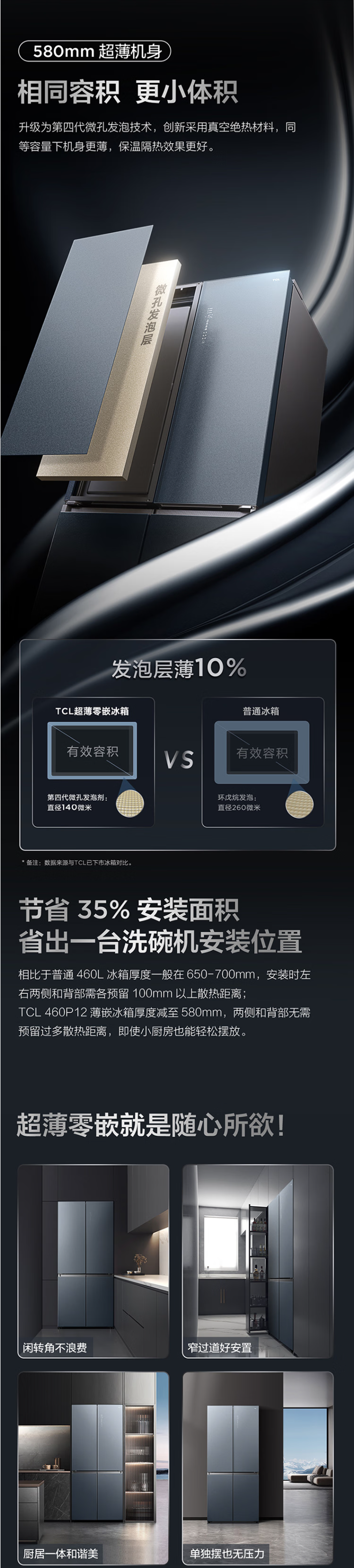 TCL460升十字双开门四门58厘米超薄嵌入大容量家用冰箱一级变频 零缝隙嵌入 多点离子杀菌R460P12-UQ BK