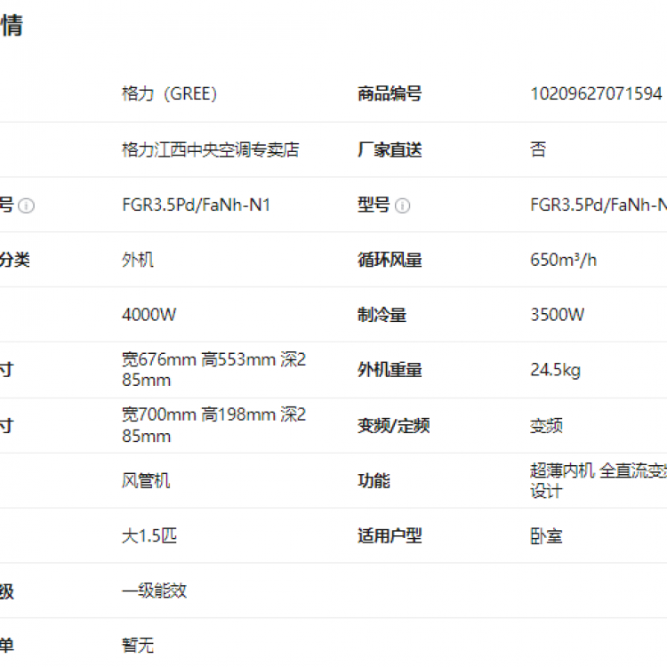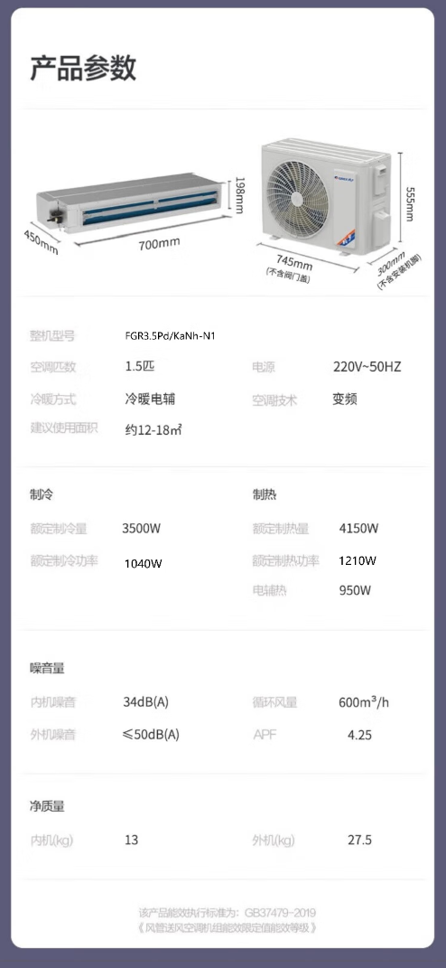 格力1.5匹 FGR3.5Pd/KaNh-N1 天花机K+系列 一级能效一拖一风管机 高温自洁 升级彩屏WIFI线控器