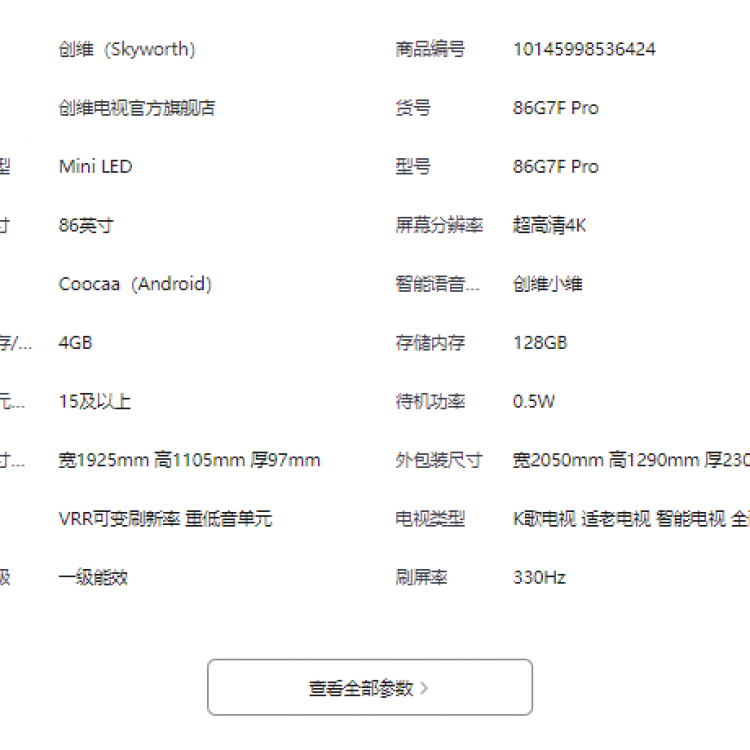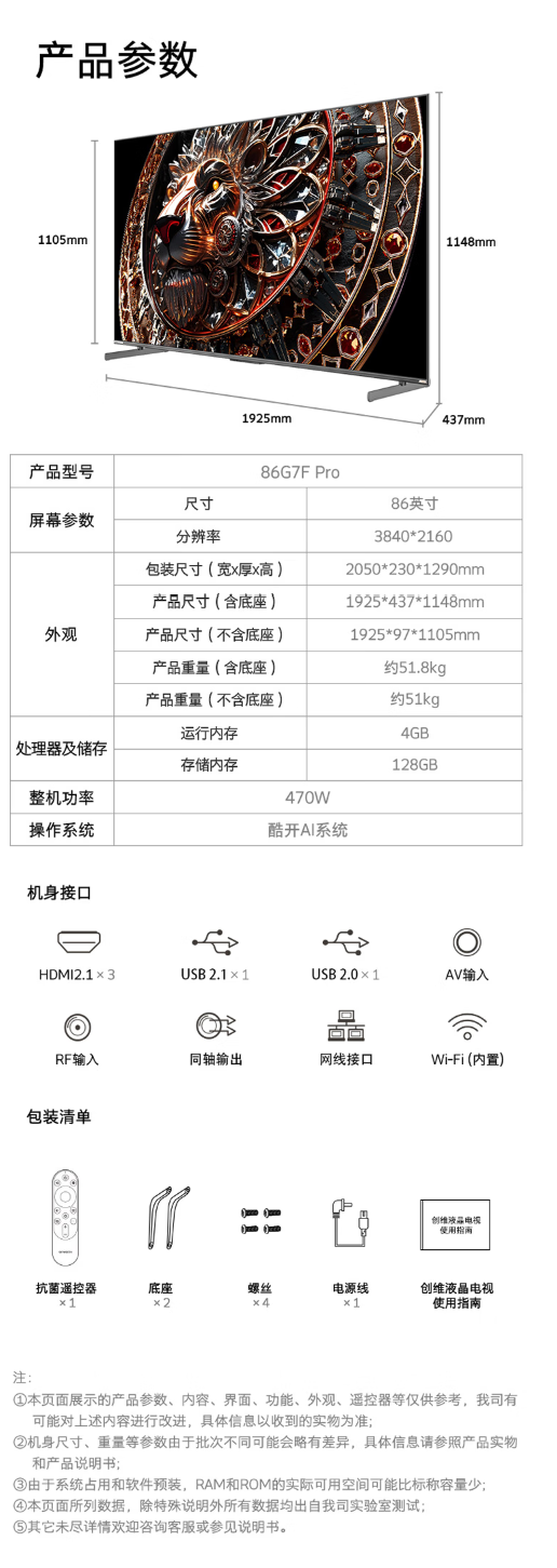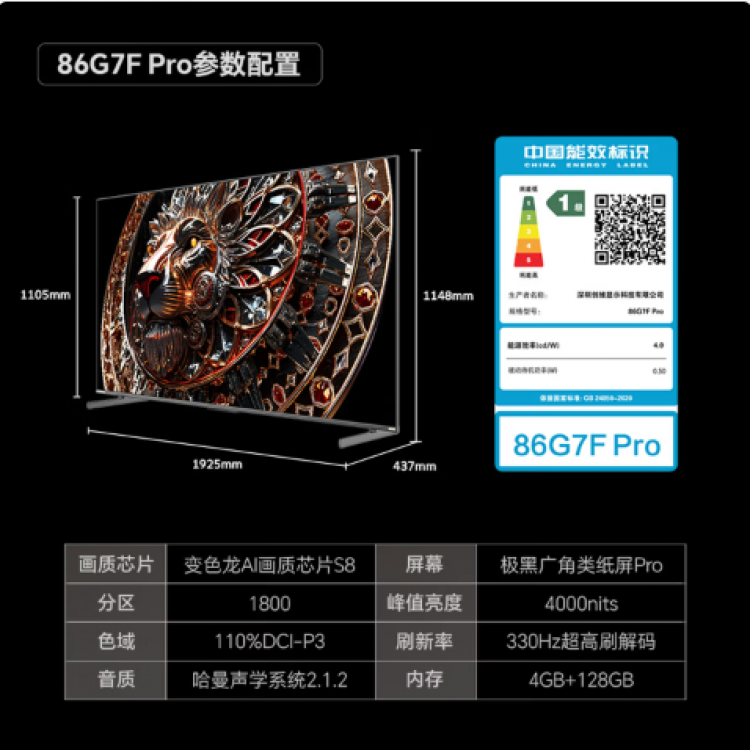 创维86G7F Pro极黑广角类纸屏 Smart MiniLED千级分区控光 哈曼2.1.2 广色域110% 高刷帧享影院4+128G 86英寸 BN