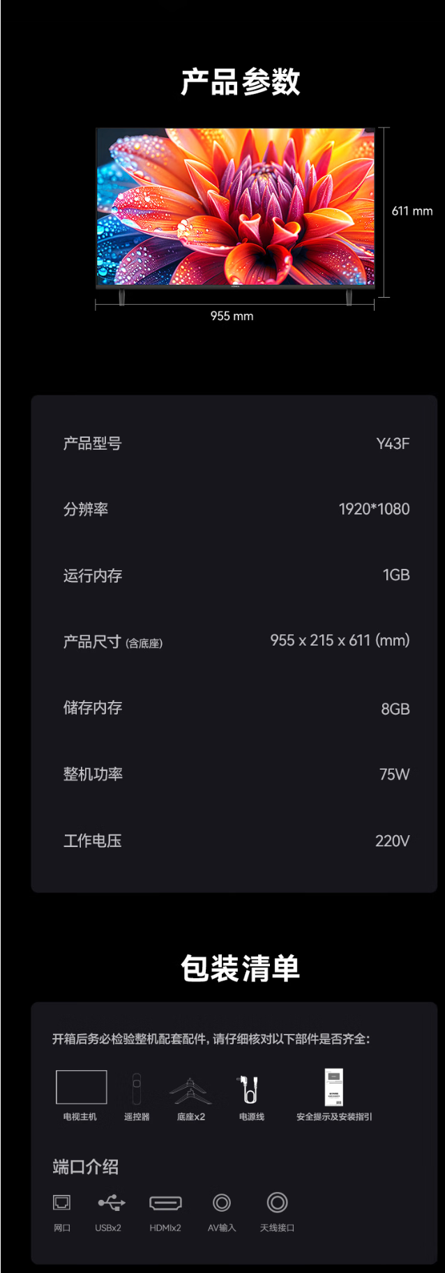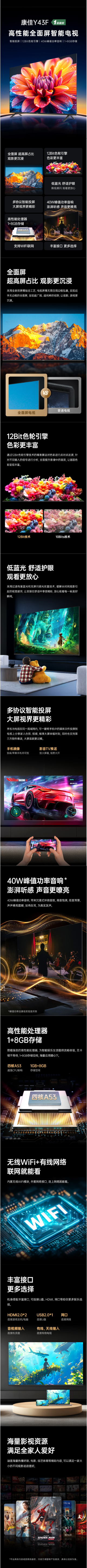 康佳Y43F 43英寸全高清全面屏12Bit色彩 防蓝光智能卧室电视一键投屏液晶电视机一级能效 BN