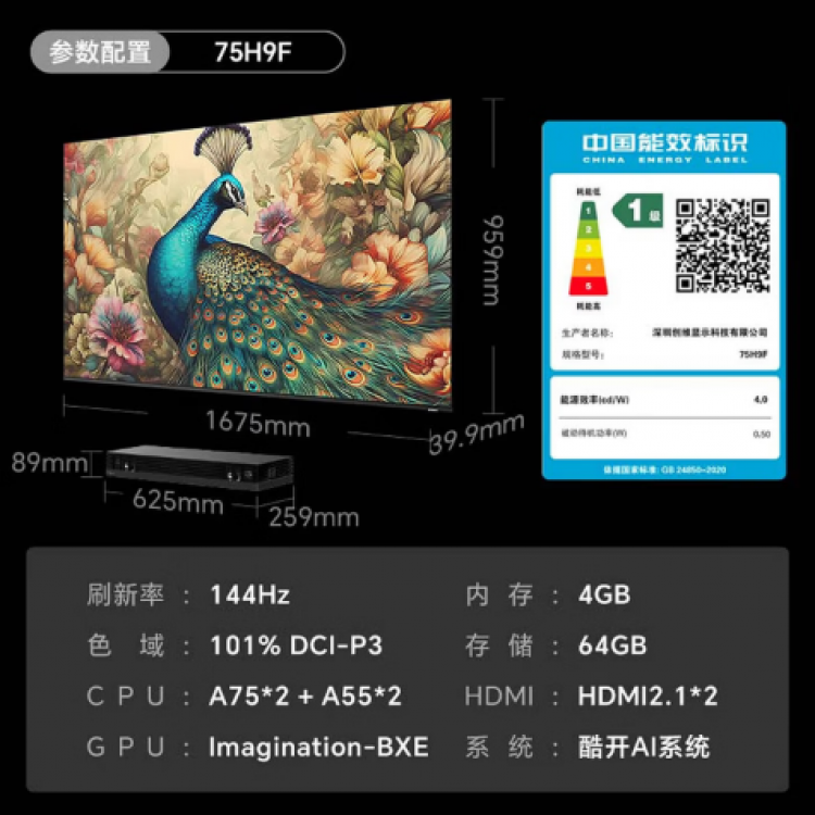创维75H9F 超薄无缝贴墙艺术电视 超强性能独立主机 一级能效4+64GB 75英寸 BN